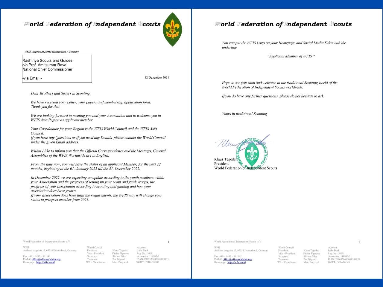 Affiliated with World Federation of Independent Scouts, Germany